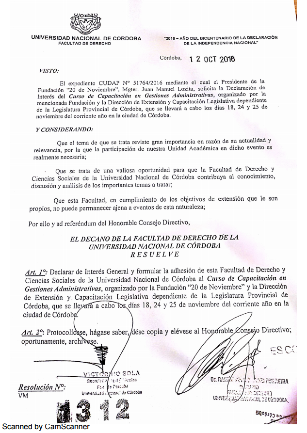 La Fundación 20 de Noviembre, con el respaldo de la Dirección de extensión y capacitaron legislativa dependiente de la legislatura de Córdoba. Realizara entre los días 18, 24 y 25 de Noviembre de 2016, en la ciudad de Córdoba, una capacitación en gestiones administrativas, el cual, la facultad de derecho de la Unc ha declarado Interés en dicha capacitación.